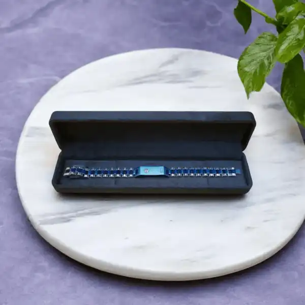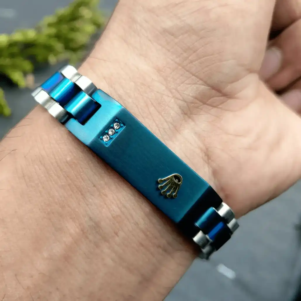 This stylish bracelet is designed to bring elegance and sophistication to any outfit. Its eye-catching blue and silver design combined with luxury detailing makes it a must-have accessory for modern fashion lovers.