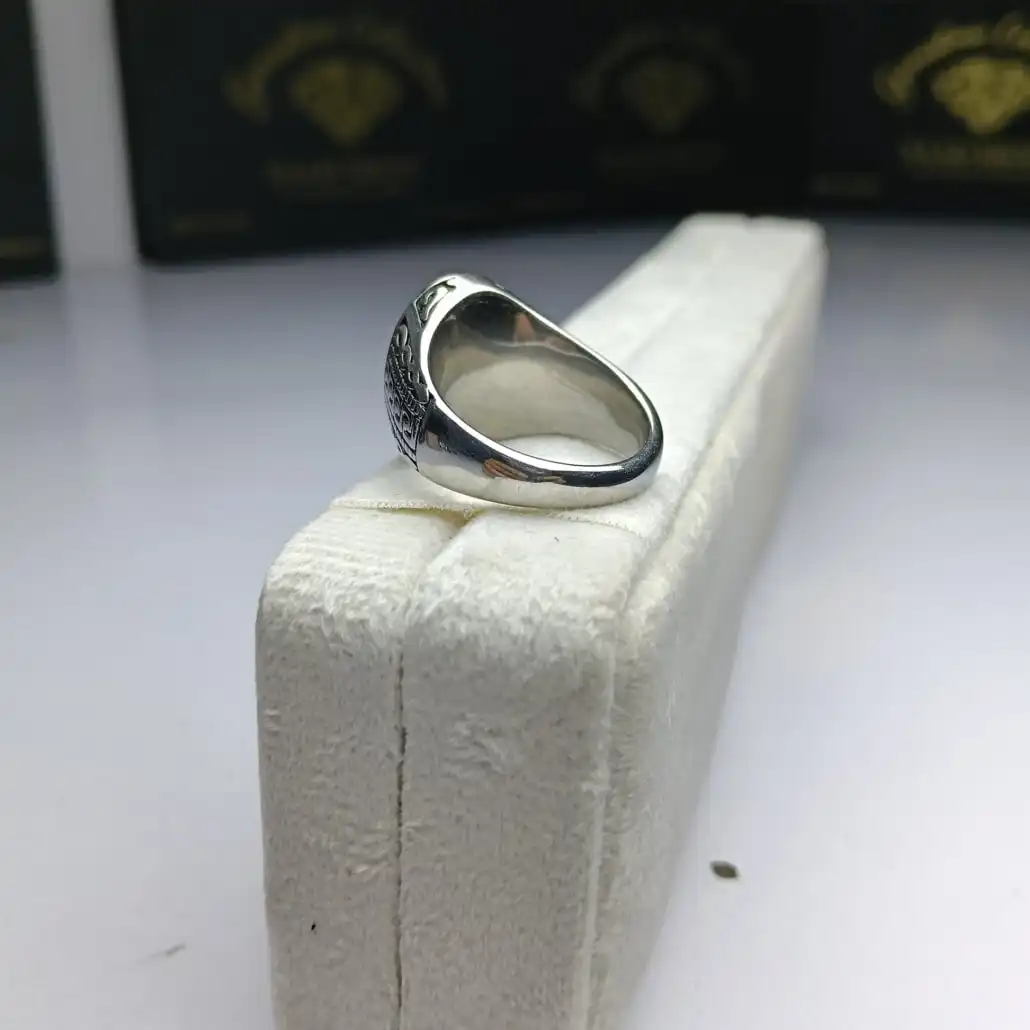 The Riivaaj collection presents this elegant ring, meticulously crafted from genuine Italian 925 sterling silver. It features a striking black Aqeeq (Agate) stone, offering a perfect fusion of timeless style and spiritual meaning. Ideal for both daily sophistication and special occasions.