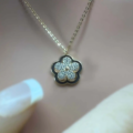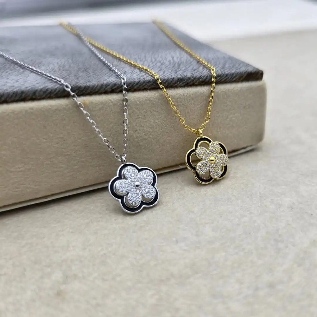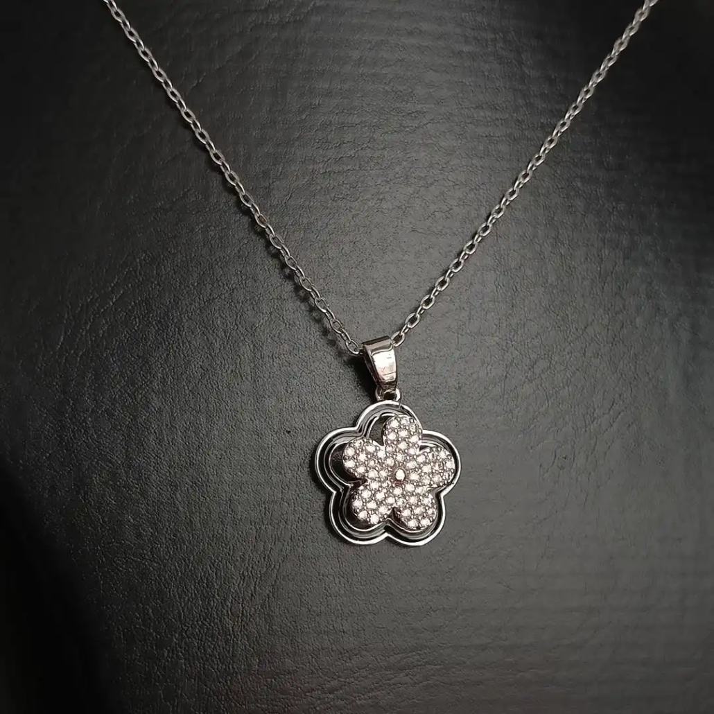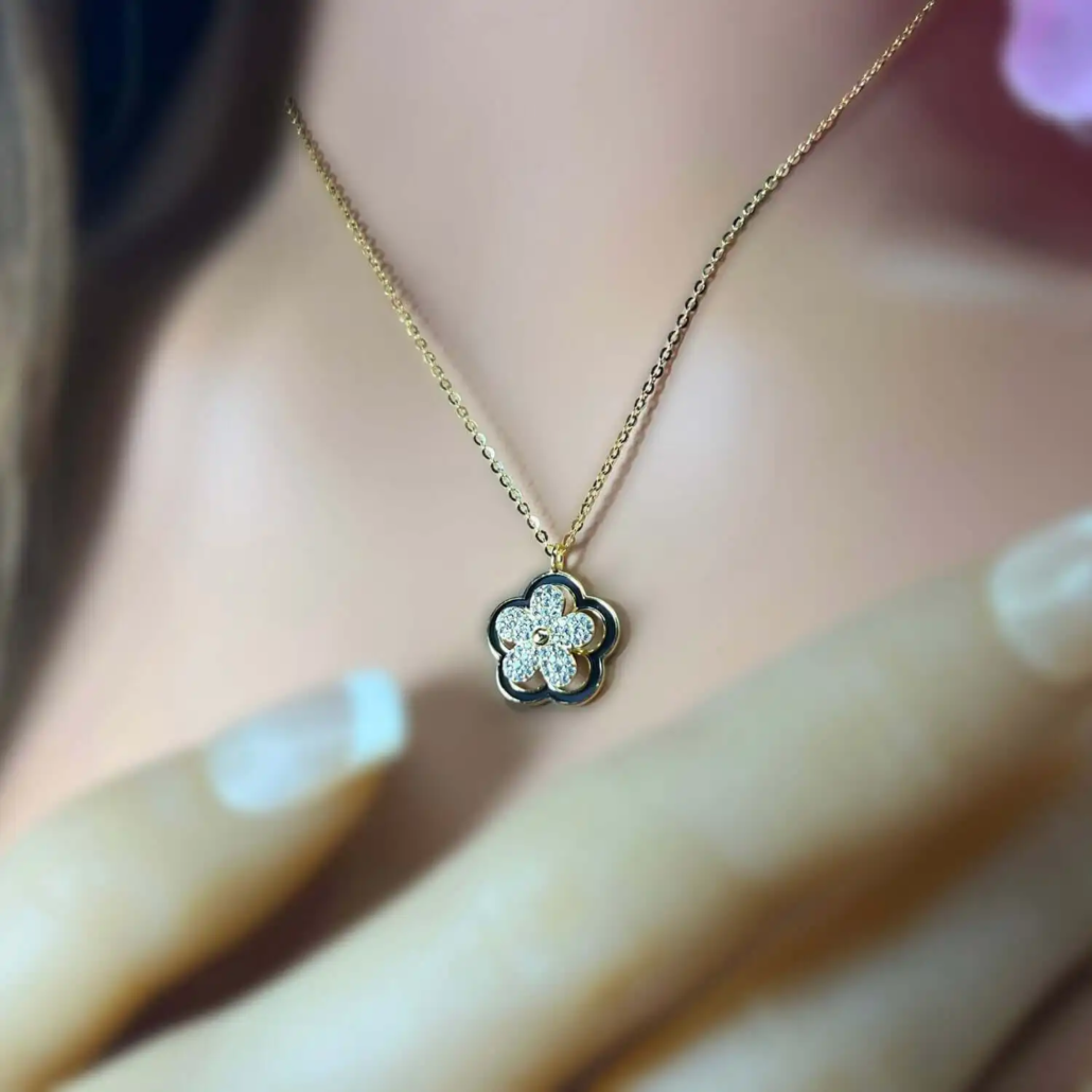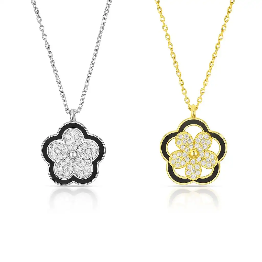 ust like flowers dancing in the wind, the Riivaaj Spinner CZ Plumeria Pendant adds a touch of movement and sparkle to your style. Featuring a pavé-set plumeria flower that spins gracefully around a stationary black enamel outline, this unique design creates a captivating layered effect.